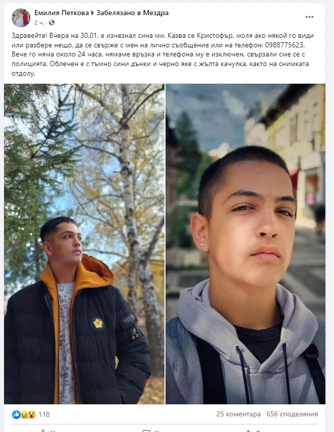 „Казва се Кристофър, ако някой го види или разбере нещо, да се свърже с мен на лично съобщение или на телефон: 0988775623. Вече го няма около 24 часа, нямаме връзка и телефонът му е изключен, свързали сме се с полицията. Облечен е с тъмно сини дънки и черно яке с жълта качулка, както на снимката отдолу", написа майка му в социалните мрежи.