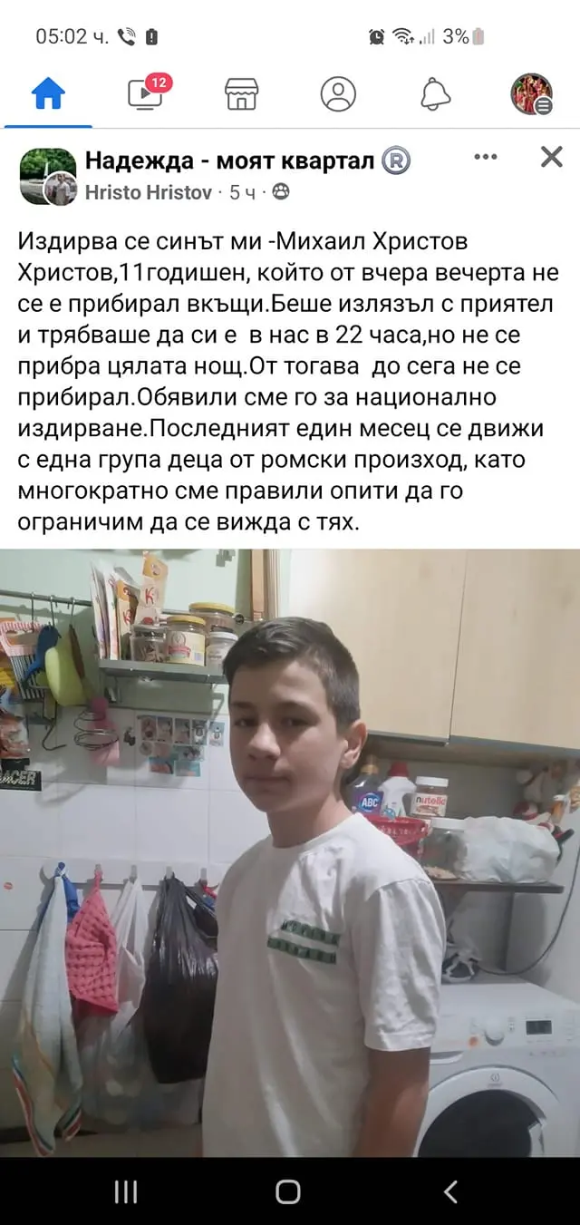Христо Христов пише, че детето е излязло в четвъртък – 29 юни – с приятел и е трябвало да се прибере в 22 часа, но така и не се е върнал. Момчето е обявено за национално издирване. Бащата пише още, че в последния месец детето се е движило в групичка с деца от ромски произход като семейството е правило многократни опити да ограничи контактите му с тях.