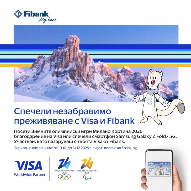 Предстоящите Зимни олимпийски игри в Милано-Кортина (Италия, 2026) ще се превърнат в незабравимо преживяване за двама от клиентите на Fibank (Първа инвестиционна банка). 10 от най-активните потребители на банковите карти Visa от Fibank ще се сдобият със смартфон Samsung Galaxy Z Fold7 5G.