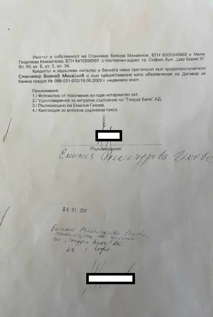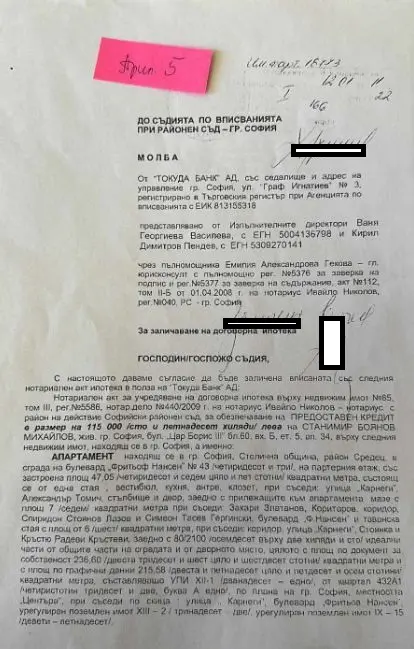Месец по-късно го ипотекира (на 21.05.2009г.) пред банката, в която работи – „Токуда банк“ за 115 000 лева. Реално го ипотекира за сума в размер на близо 4 пъти по-голяма от покупната цена. (Виж прил.2)