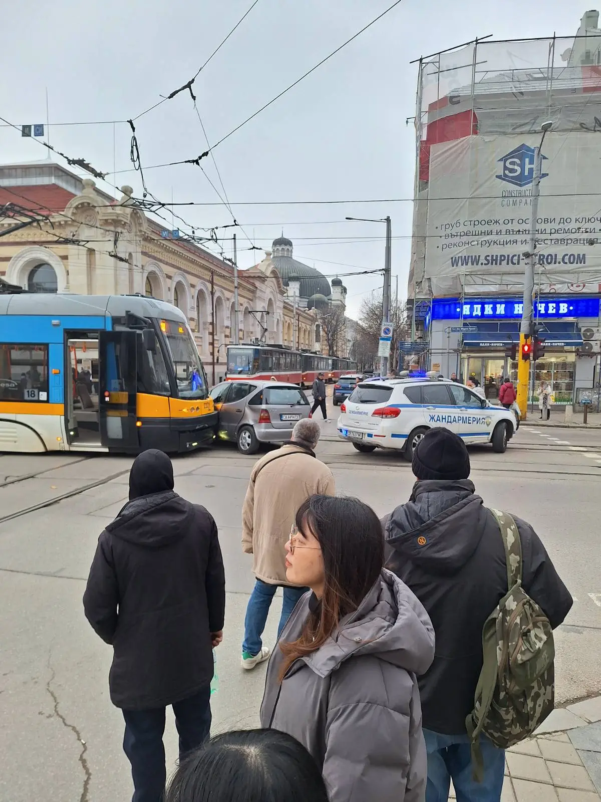 Катастрофа между трамвай и лек автомобил блокира кръстовището на бул. "Мария Луиза" и ул. "Екзар Йосиф" пред Централни хали в София.