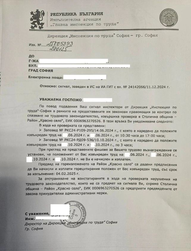 Става въпрос за напуснал служител, който е бил подложен на „психически тормоз“ от страна на настоящото ръководство. След подаден сигнал, Инспекцията по труда е издала акт, с който задължава Николаева да изплати дължимите средства. Наред с това на районната администрация ще бъдат наложени и административни санкции.