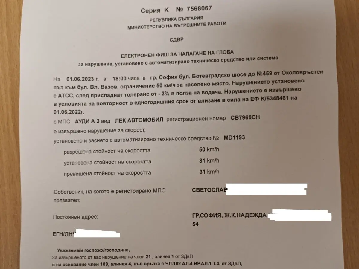 Случката е станала на 1 юни т. г. в София на бул. "Ботевградско шосе". Според електронен фиш с номер 7568067, в 18 часа при ограничение от 50 километра в час "Ауди" с номер СВ7969СН е преминало със 81 километра в час (след приспадане на 3-процентния толеранс), което е превишeние от 31 километра в час. Установен е собственикът на колата Станислав С. и му е наложена глоба в размер на 800 лева, съответно при плащане до 14 дни - редуцирана до 560 лева.