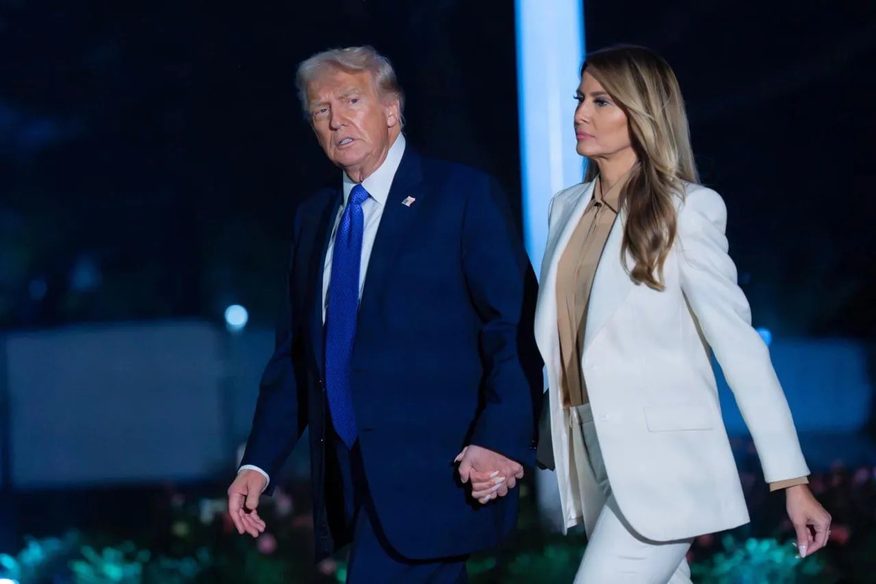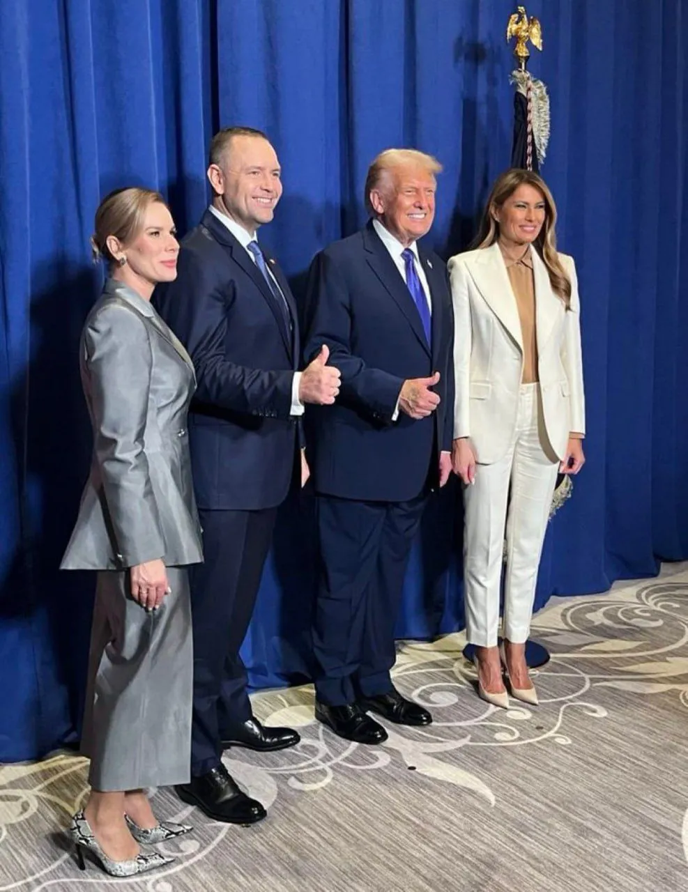 - косата на Мелания Тръмп пада по различен начин върху лявото ѝ рамо на кадъра с Росен Желязков;