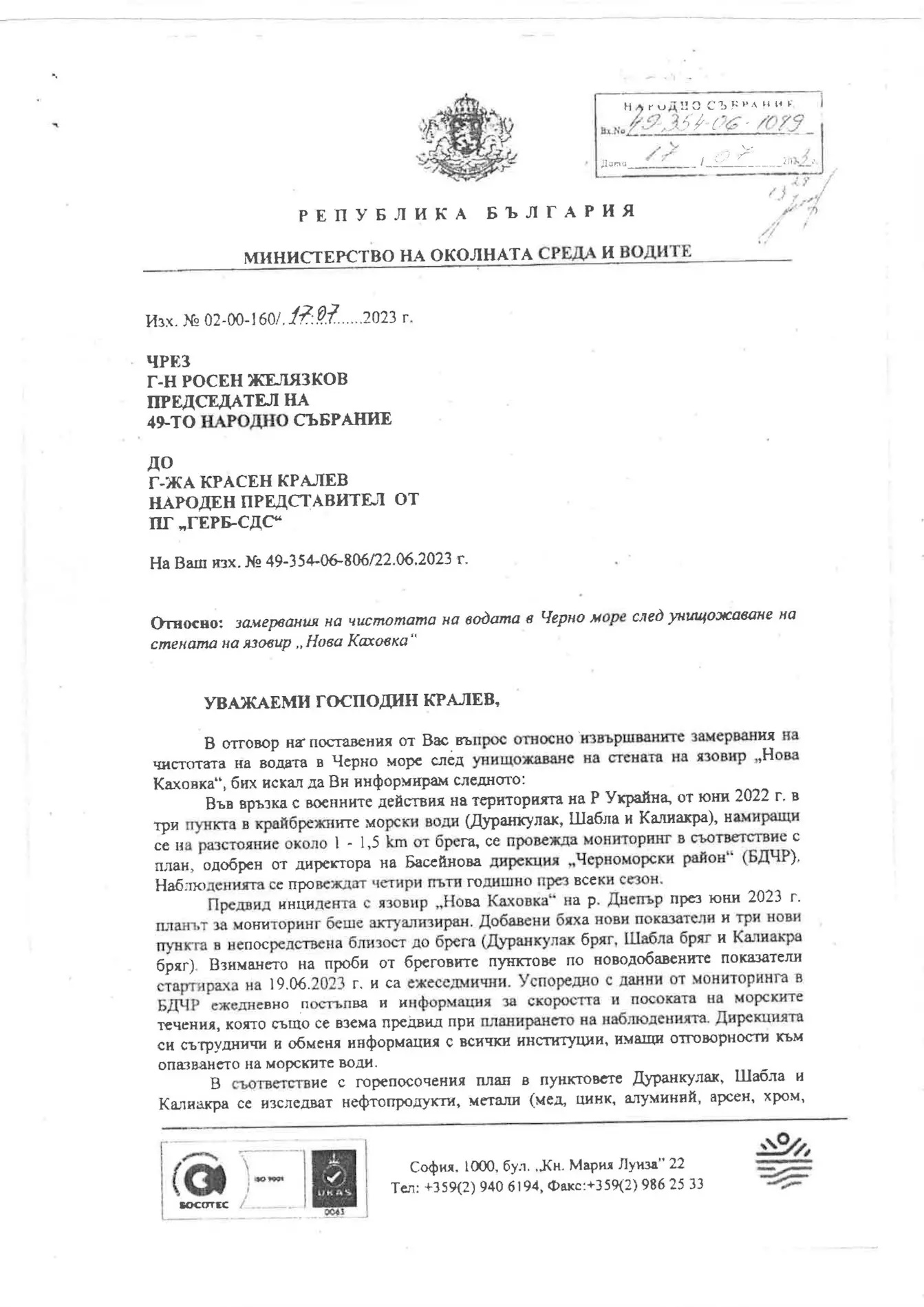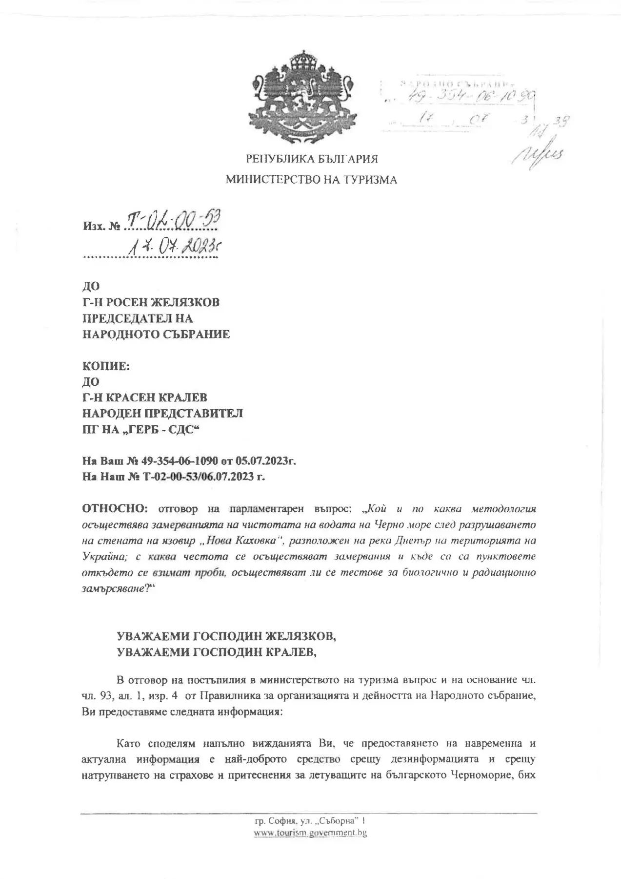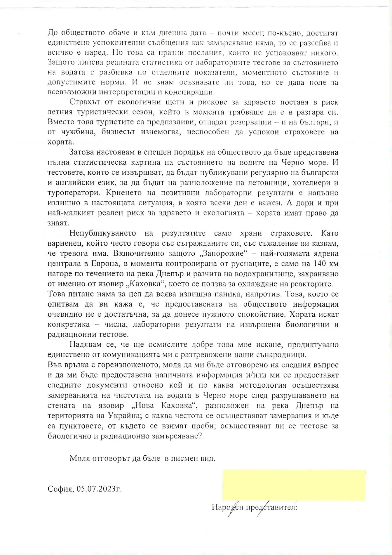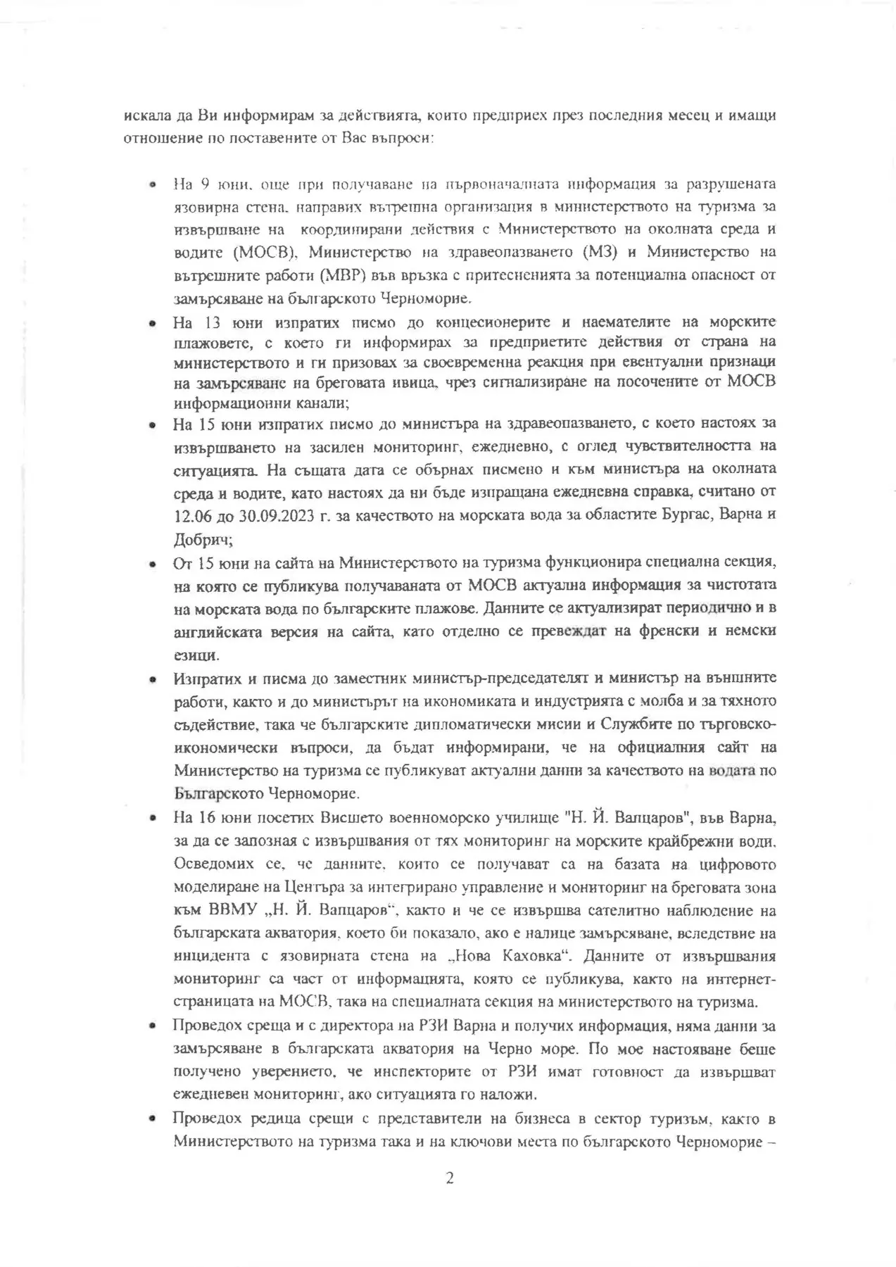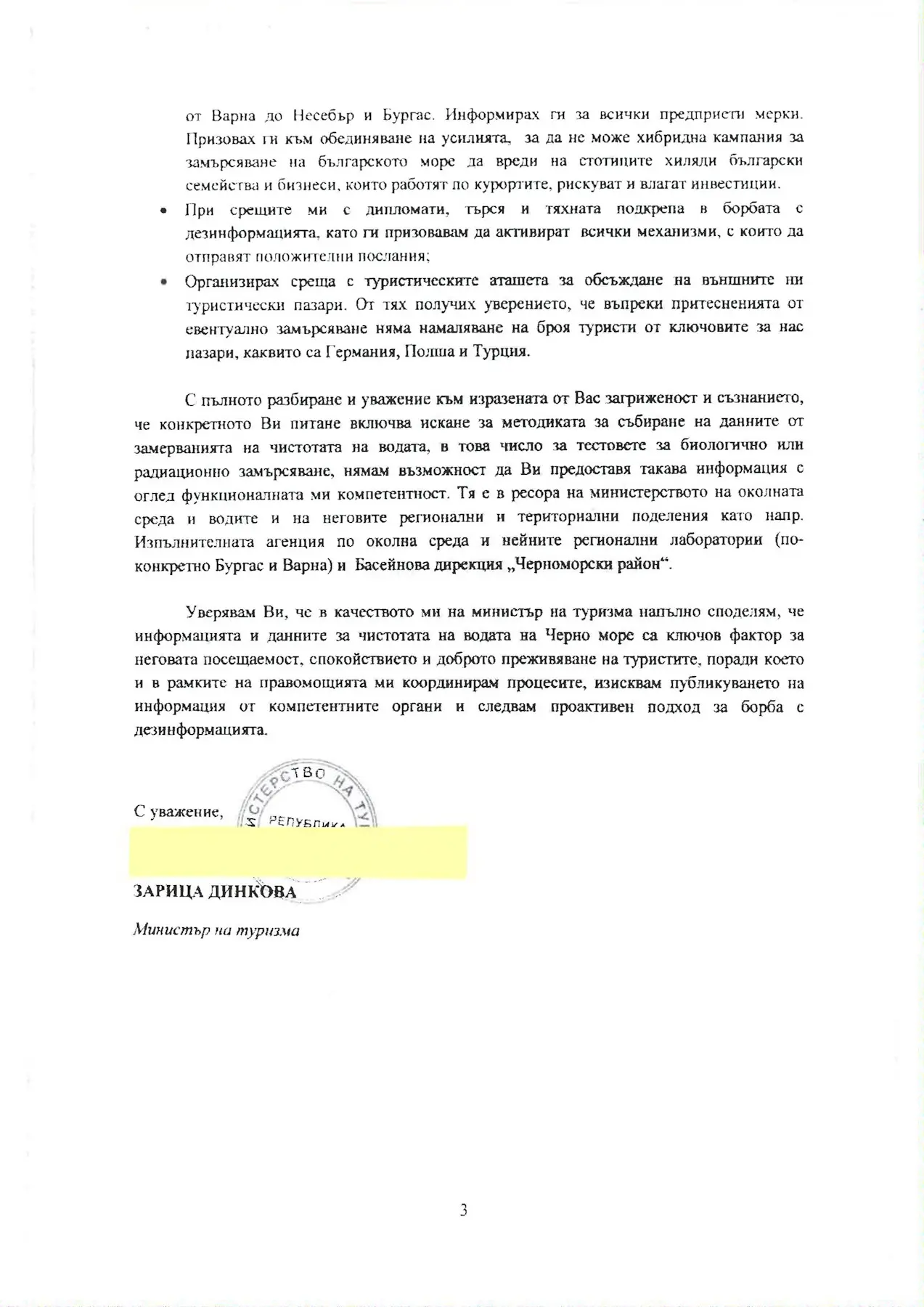„Уверявам Ви, че в качеството ми на министър на туризма напълно споделям, че информацията и данните за чистотата на водата на Черно море са ключов фактор за неговата посещаемост, спокойствието и доброто преживяване на туристите, поради което и в рамките на правомощията ми координирам процесите, изисквам публикуването на информация от компетентните органи и следвам проактивен подход за борба с дезинформацията. При срещите ми с дипломати, търся и тяхната подкрепа в борбата с дезинформацията, като ги призовавам да активират всички механизми, с които да отправят положителни послания. Организирах среща с туристическите аташета за обсъждане на външните ни туристически пазари. От тях получих уверението, че въпреки притесненията от евентуално замърсяване няма намаляване на броя туристи от ключовите за нас пазари, каквито са Германия, Полша и Турция“, отговаря министърът на туризма Зарица Динкова.