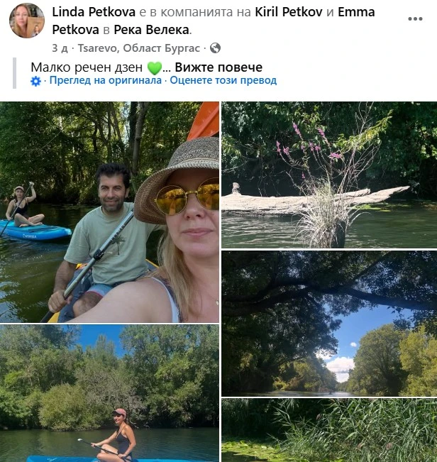 Преди два дни съпругата на Кирил Петков – Линда Петкова – публикува снимки във Фейсбук, на които двамата карат падъл борд (SUP) по река Велека. „Малко речен дзен“, написа тя към кадрите.