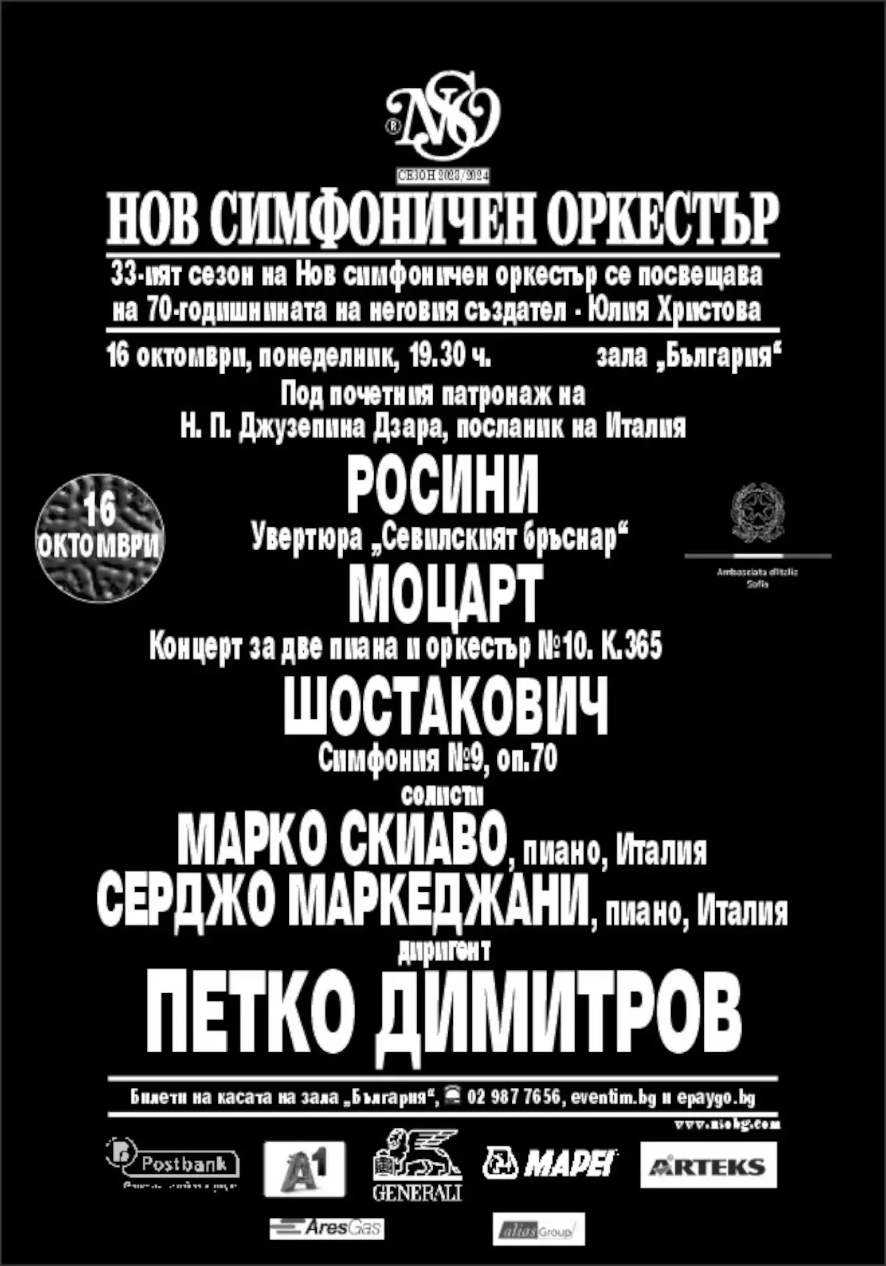 На 16 октомври от 19.30 ч. с галаконцерт в зала „България“ Нов симфоничен оркестър, в сътрудничество с Посолството на Италия в София, ще открие своя XXXIII сезон под патронажа на Посланичката Джузепина Дзара.