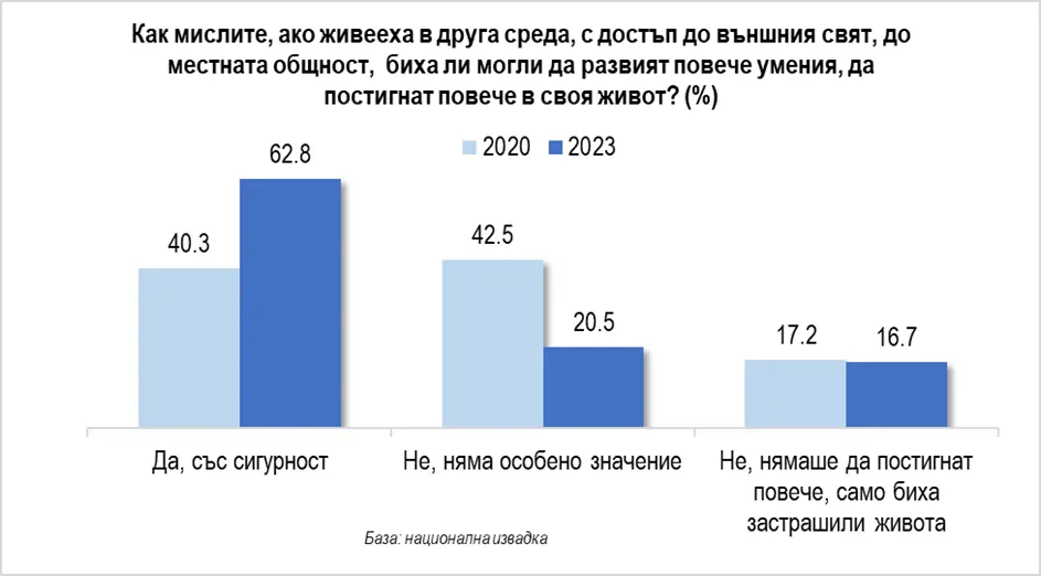 Основните предизвикателства пред процеса на деинституционализация според проведено социологическо проучване от агенция „Алфа Рисърч“ относно „Нагласите на обществото към хората с умствена изостаналост и с психични разстройства“ през 2023 г. са няколко. Към настоящия момент обществото вижда три основни позитива от процеса: по-добри материални условия, по-добра грижа, повече самостоятелност. Същевременно, необходимо условие за успех на процеса, е осигуряването на достатъчен като брой, добре мотивиран и обучен персонал, който да се грижи за хората с тези проблеми. Постепенно нарастват запознатостта и положителното отношение към мерките по деинституционализация на хората с умствена изостаналост и психични разстройства. На национално ниво нарастват от 22% през 2020 г. на 33% през 2023 г. Сред местните общности запознатостта и одобрението нарастват от 41% до 48%, т.е. вече почти всеки втори знае и одобрява процеса. Важно е да се отбележи, че местните общности от населените места, в които вече са разкрити нови услуги, реагират позитивно – независимо дали са запознати или не с мерките, подкрепата за тях сериозно доминира над неодобрението (63%:21%). Малко по-скептична остава широката общественост, но и там одобрението надхвърля неодобрението (53:31%). Все още значителна част от обществото е по-скоро пасивна и гледаща отстрани с известно съчувствие, но без желание да се ангажира и да разбере в дълбочина проблемите и същността на хората с такива проблеми. За да бъде преодоляна стигмата, която все още тегне над тях, те трябва да бъдат видими с лични истории, които показват положително развитие за тях вследствие на новия тип грижа.