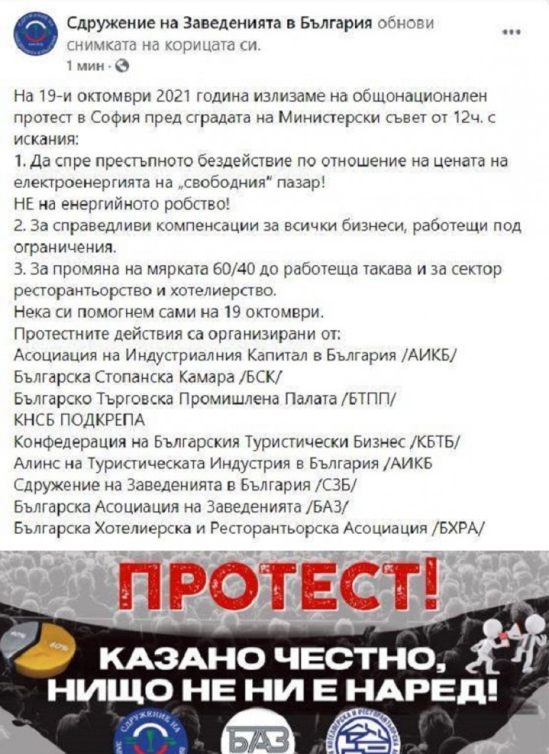 На 19-и октомври 2021 година излизаме на общонационален протест в София пред сградата на Министерски съвет от 12ч. с искания: