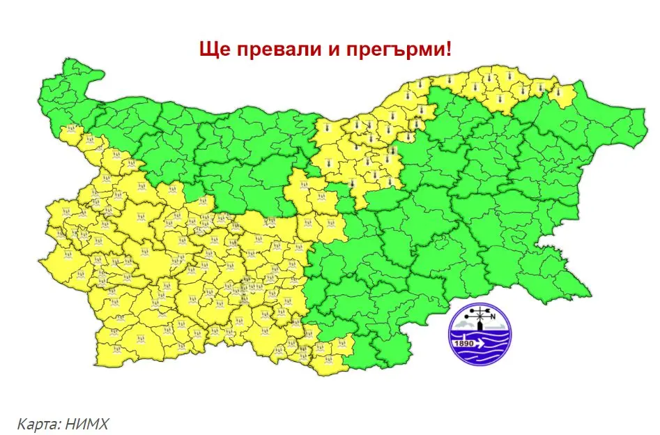 Жегите обаче продължават в отделни райони на страната. Жълт код за високи температури е в сила за областите Велико Търново, Русе, Силистра и части от Търговище и Разград.