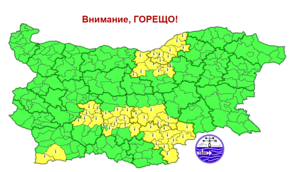 Предупреждението е в сила за областите: Благоевград, Велико Търново, Пловдив, Русе, Стара Загора, Хасково и Пазарджик.