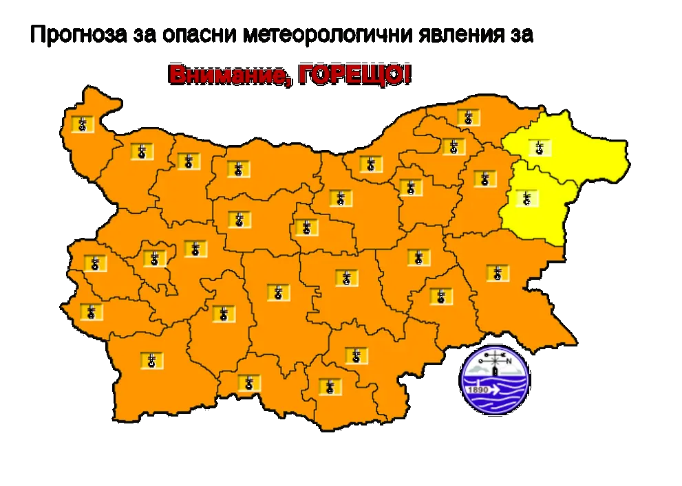 Оранжев код за опасни горещини обявиха и за днес от Националния институт по метеорология и хидрология (НИМХ). Той е в сила за всички области в страната, с изключение на Добрич и Варна, където е обявен жълт код.