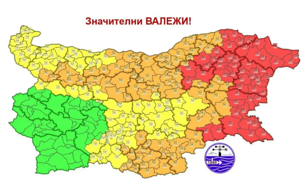 Жълт код е обявен за Видин, Монтана, Враца, Плевен, Ловеч, София-област, Пазарджик, Смолян, Стара Загора, Сливен и Пловдив.