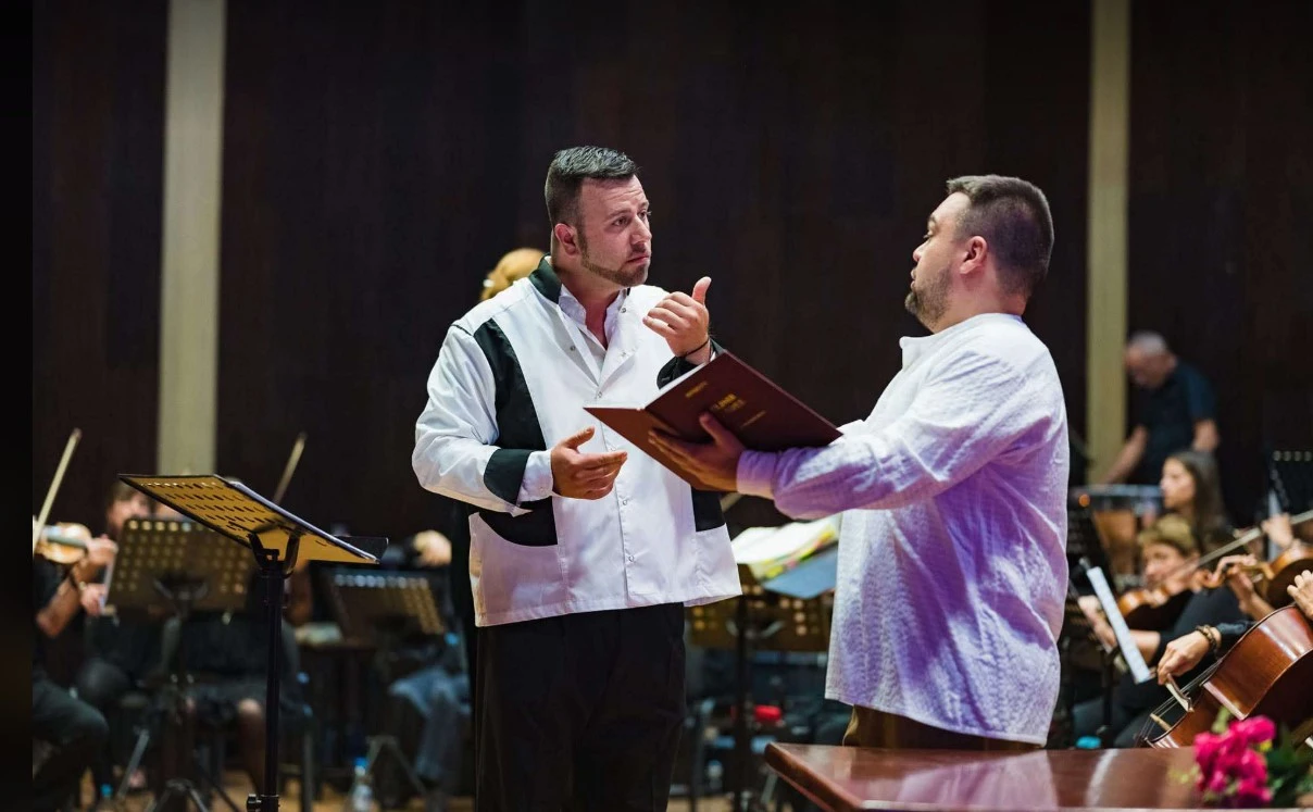 Оперният бас Стефан Димитров в ролята на лекаря-шарлатонин Дулкамара от “Любовен еликсир” (на снимките на сцена).