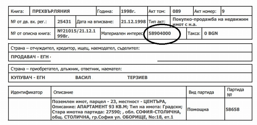 Бащата Александър Терзиев пък е продал друг имот от 480 кв.м в местността „Кокалянски ханчета“, в село Кокаляне.