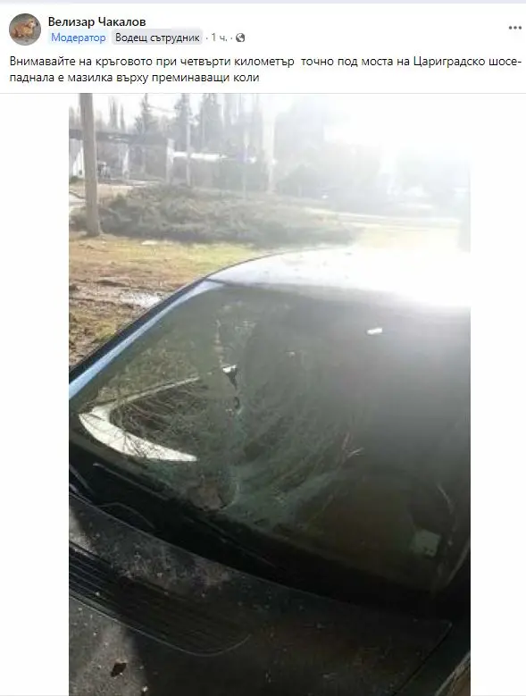Бетонна отломка от моста на бул. „Цариградско шосе“ при Четвърти километър в София падна и проби предното стъкло на кола в движение. За щастие, няма пострадали.