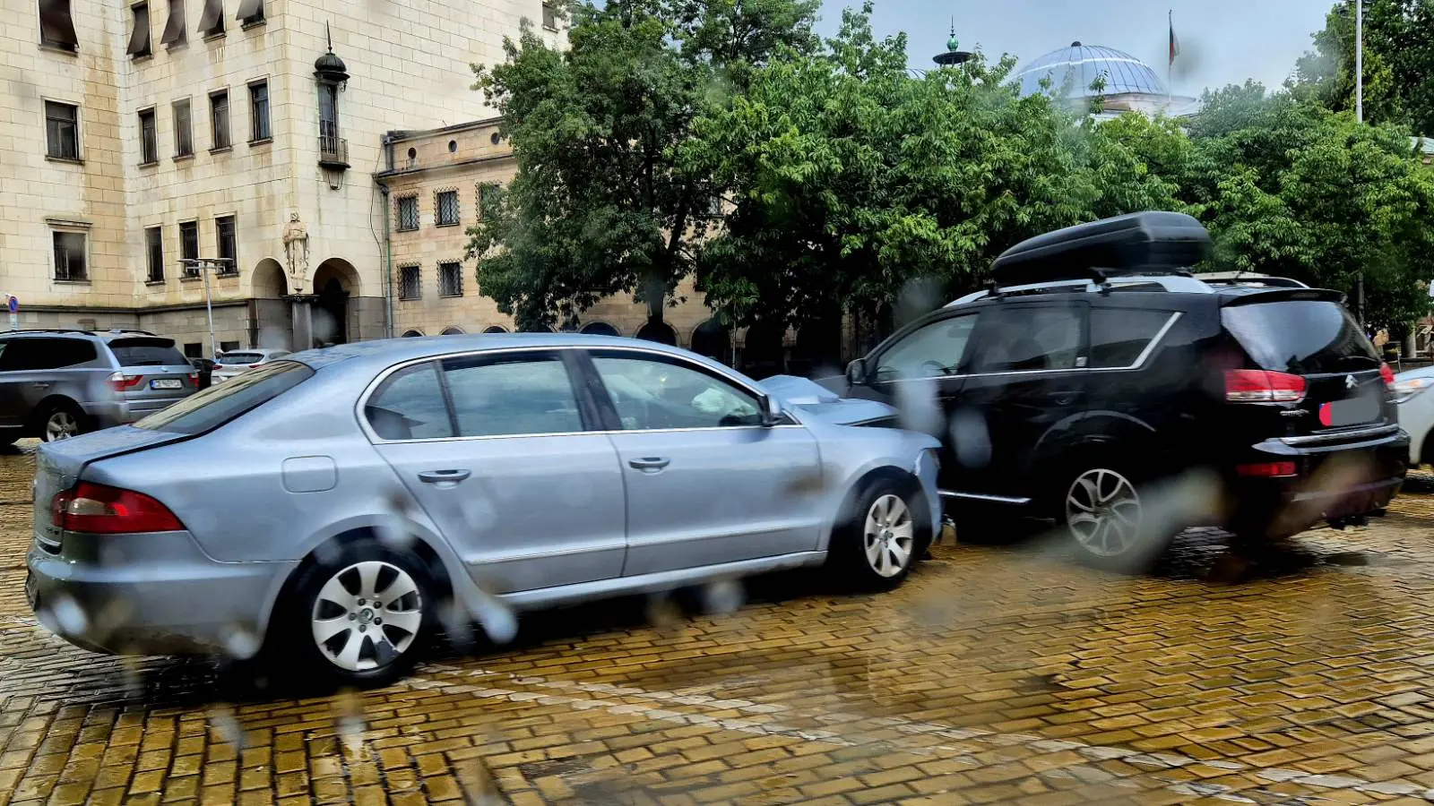 Силна гръмотевична буря, придружена със светкавици и силен дъжд, не подмина и София. Заради дъжда в центъра два леки автомобила се удариха точно до сградите на президентството, БНБ и Народно събрание.