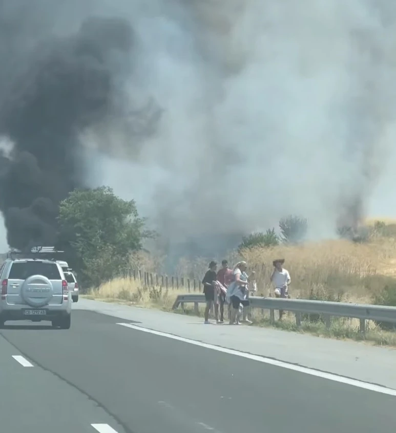 Пожар на АМ „Тракия“ след запалена кола, огънят обхвана и нива край пътя (СНИМКИ)