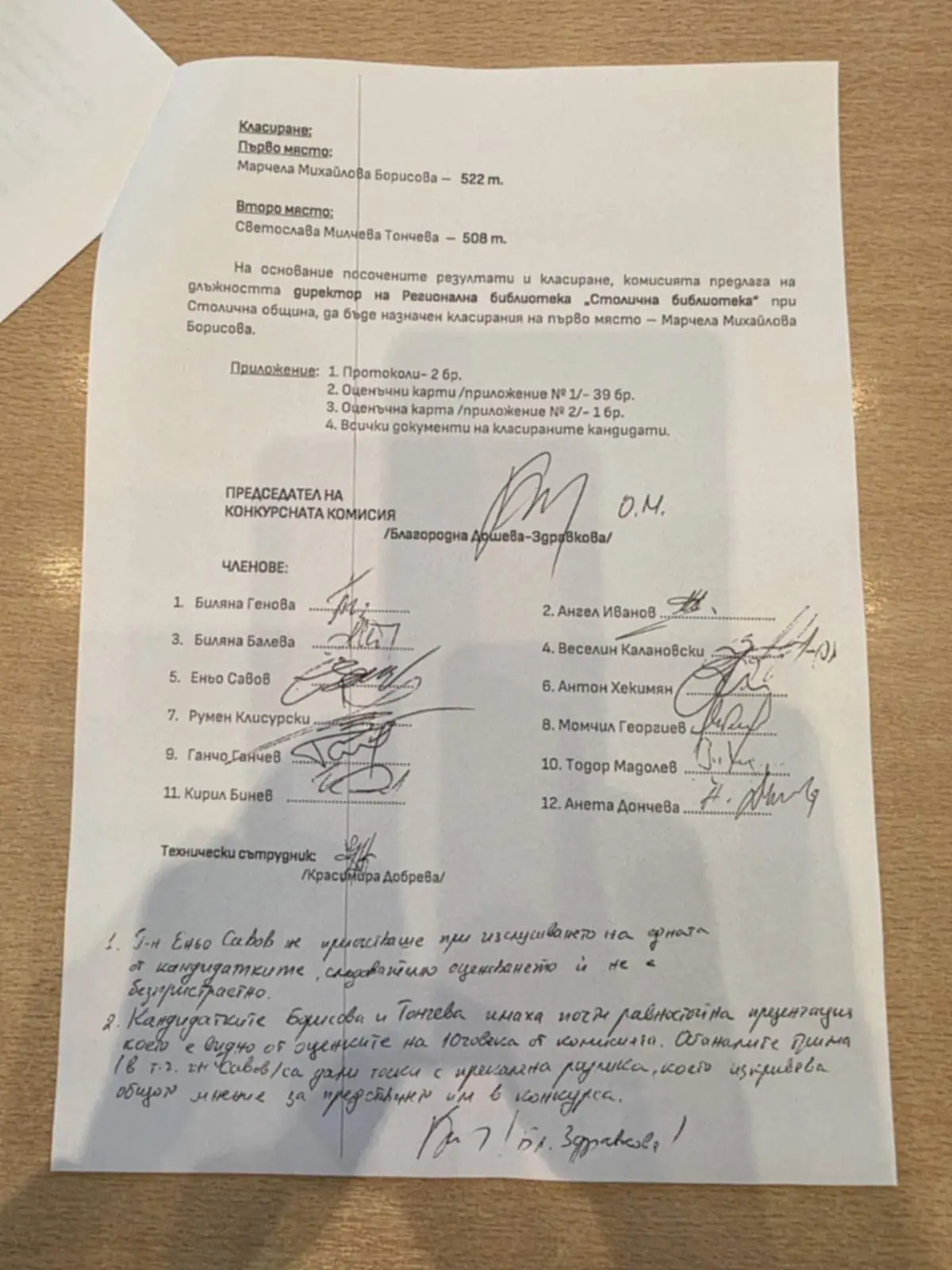„Изпратеният Ви документ е протокол от конкурс, който не е спечелен от кандидата на ПП-ДБ, а от независим непартиен кандидат - Марчела Борисова. Голяма част от членовете на комисията от ПП- ДБ и подчинената им администрация не приемат резултата и загубата на техния кандидат. Позовавайки се на разлики в оценките на независими от ПП- ДБ членове на комисията, както и на други несъществени факти и обстоятелства, а именно еднолично изразено писмено мнение до кмета на синдикалист в Столична библиотека, което се разминава с оценката на представителя на КНСБ в конкурсната комисия, кметът Васил Терзиев не утвърждава протокола“, продължават възмутените служители.