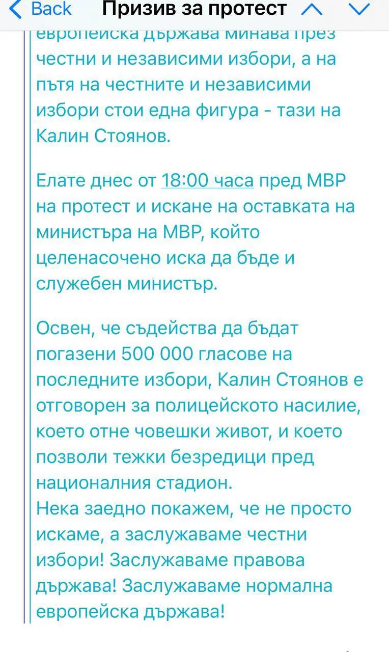 В мейла си от ПП пишат, че протестът трябва да е против вътрешния министър Калин Стоянов, защото според тях той имал участие в кражба на гласове и се съмняват в честността на вота, без да има каквито и да било доказателства за техните твърдения.