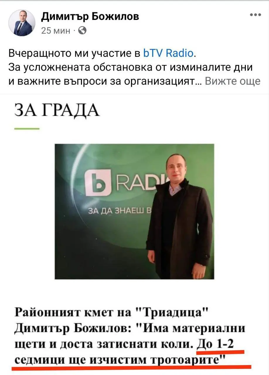Кметът на район „Триадица“ Димитър Божилов обяви победоносно, че е успял да „отпуши“ 10 улици от паднали дървета. Това става три дни след снеговалежите в София.