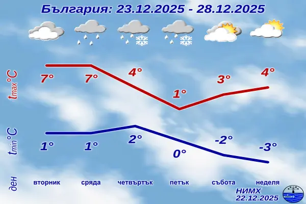 След снеговалежите, около Стефановден (27 декември) времето ще е с параметрите на зимата. Облачността – динамична, с разкъсвания, сутрешни температури до минус 7 – минус 8 градуса, денем – в интервала 0-5 градуса.