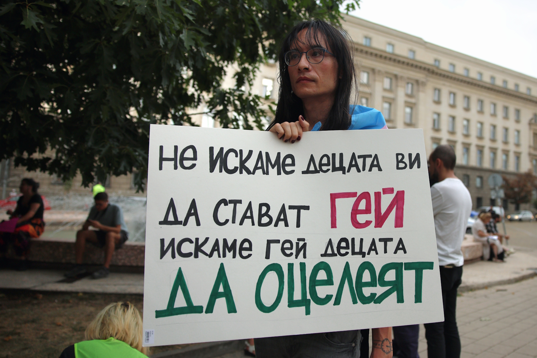 „Нашите деца трябва да бъдат оставени на мира. Не трябва да има влияние в училищата. Децата са наивни, може лесно да бъдат манипулирани“, заяви присъстващ на контрапротеста.