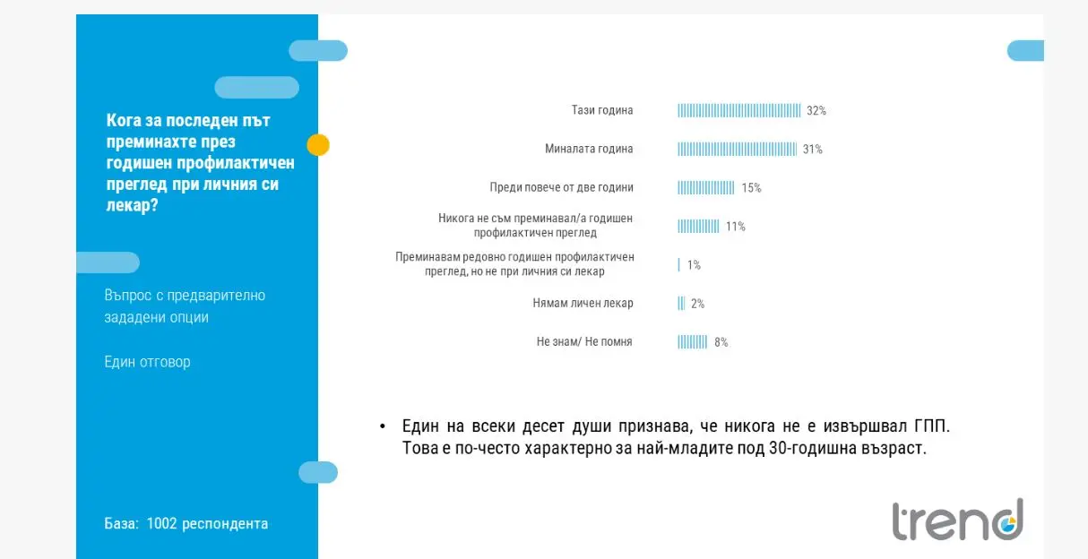 Един на всеки десет души никога не е ходил на годишен профилактичен преглед. Това е по-характерно за най-младите българи под 30-годишна възраст, сочи национално проучване на социологическа агенция „Тренд“ на тема „За нагласите на българите към годишните профилактични прегледи“.