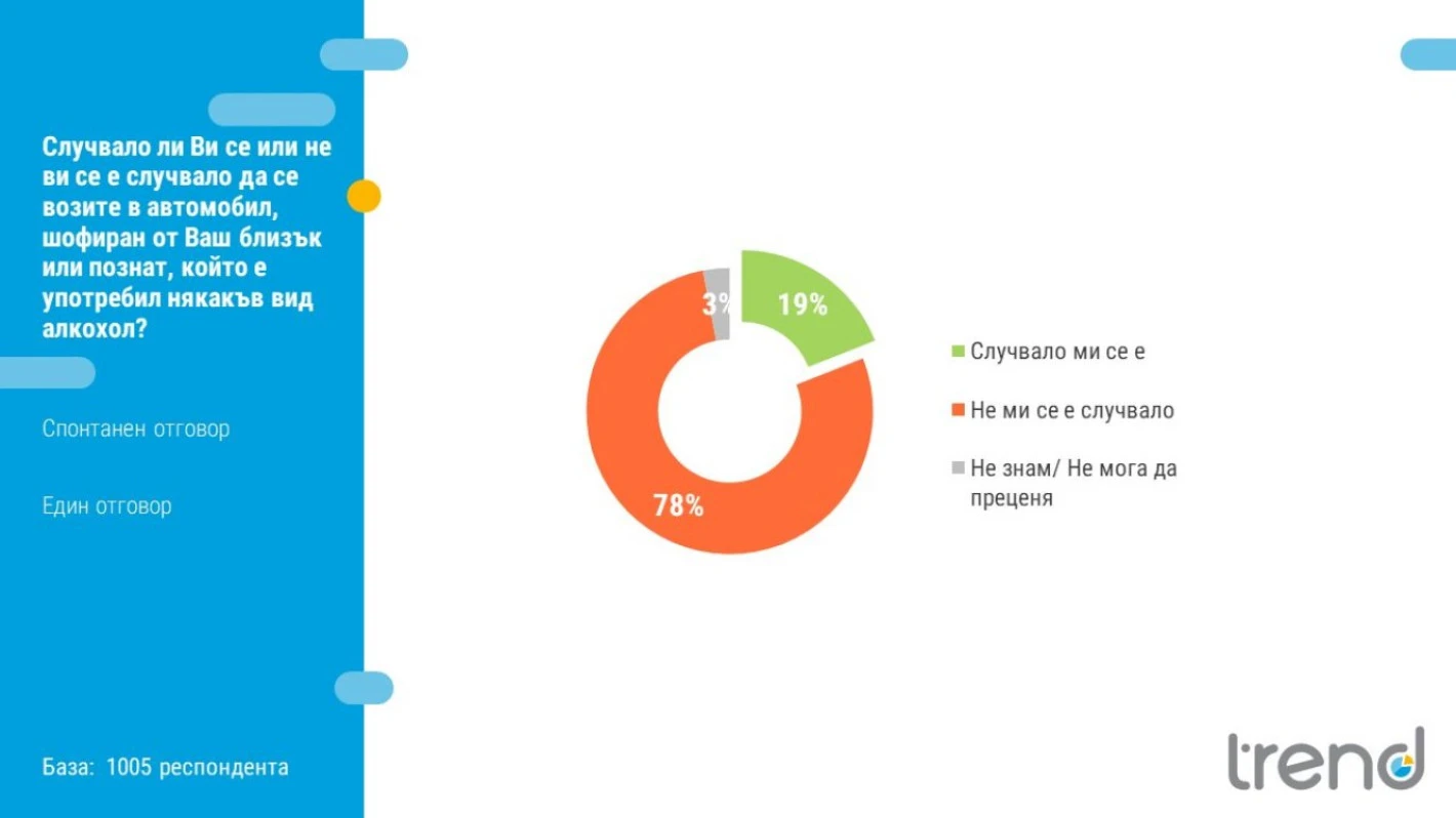 Близо една пета от българите са се возили при шофьор, употребил алкохол, показват данните от проучване на „Тренд“ за нагласите на българите спрямо шофирането в нетрезво състояние. Според изследването 37% са ставали свидетели как техен близък или познат сяда зад волана след употреба на алкохол или наркотици. Общо 275 хиляди българи признават, че са се качвали да шофират в нетрезво състояние.