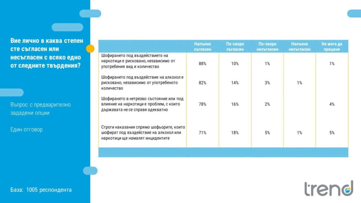 Категорично доминира мнението, че шофирането под въздействие на алкохол е рисковано, независимо от употребеното количество - 96% са напълно или по-скоро съгласни с това. Още по-категорична е оценката за шофирането под въздействието на наркотици - 98% са напълно или по-скоро убедени, че то е опасно, независимо от употребения вид и количество.