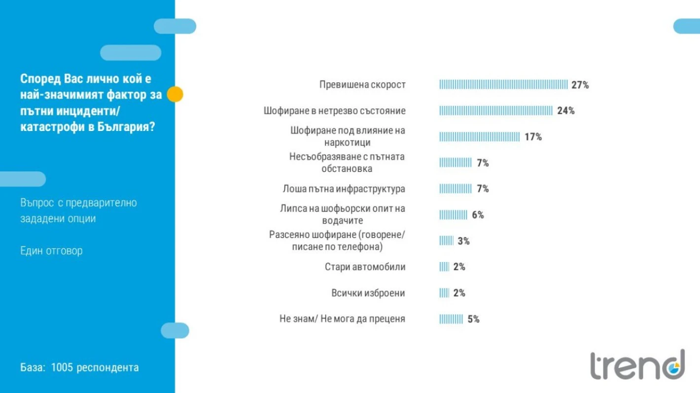 Според участниците в проучването трите водещи фактора за пътни инциденти в страната са превишената скорост (27%), шофирането под въздействие на алкохол (24%) и шофирането след употреба на наркотици (17%).