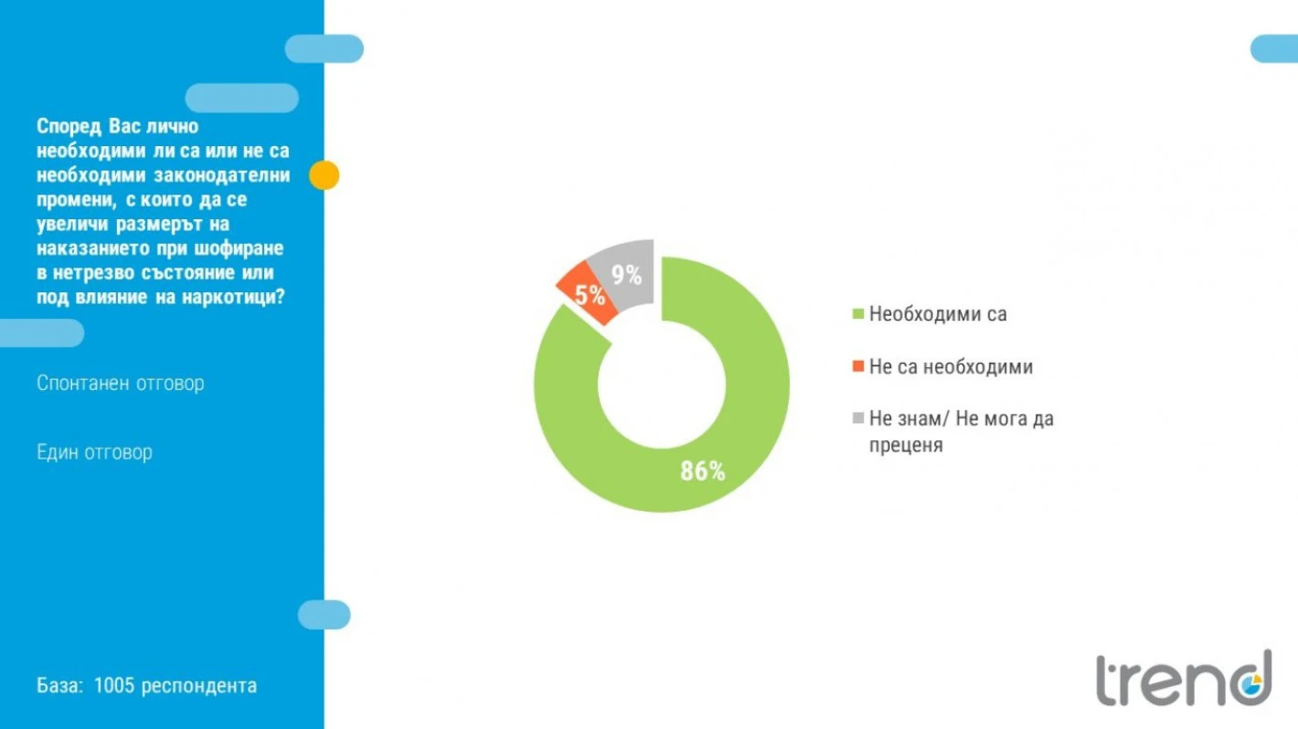 Мнозинството от българите (86%) счита, че са необходими законодателни промени, с които да се увеличи размерът на наказанието при шофиране под въздействие на алкохол и/или наркотици. По-строгите наказания се свързват с намаляване броя на инцидентите - 89% са по-скоро или напълно убедени в това. Същевременно се наблюдава консенсус по отношение на мнението, че към момента държавата не се справя адекватно с нарушителите на закона - 94% споделят това напълно или донякъде.