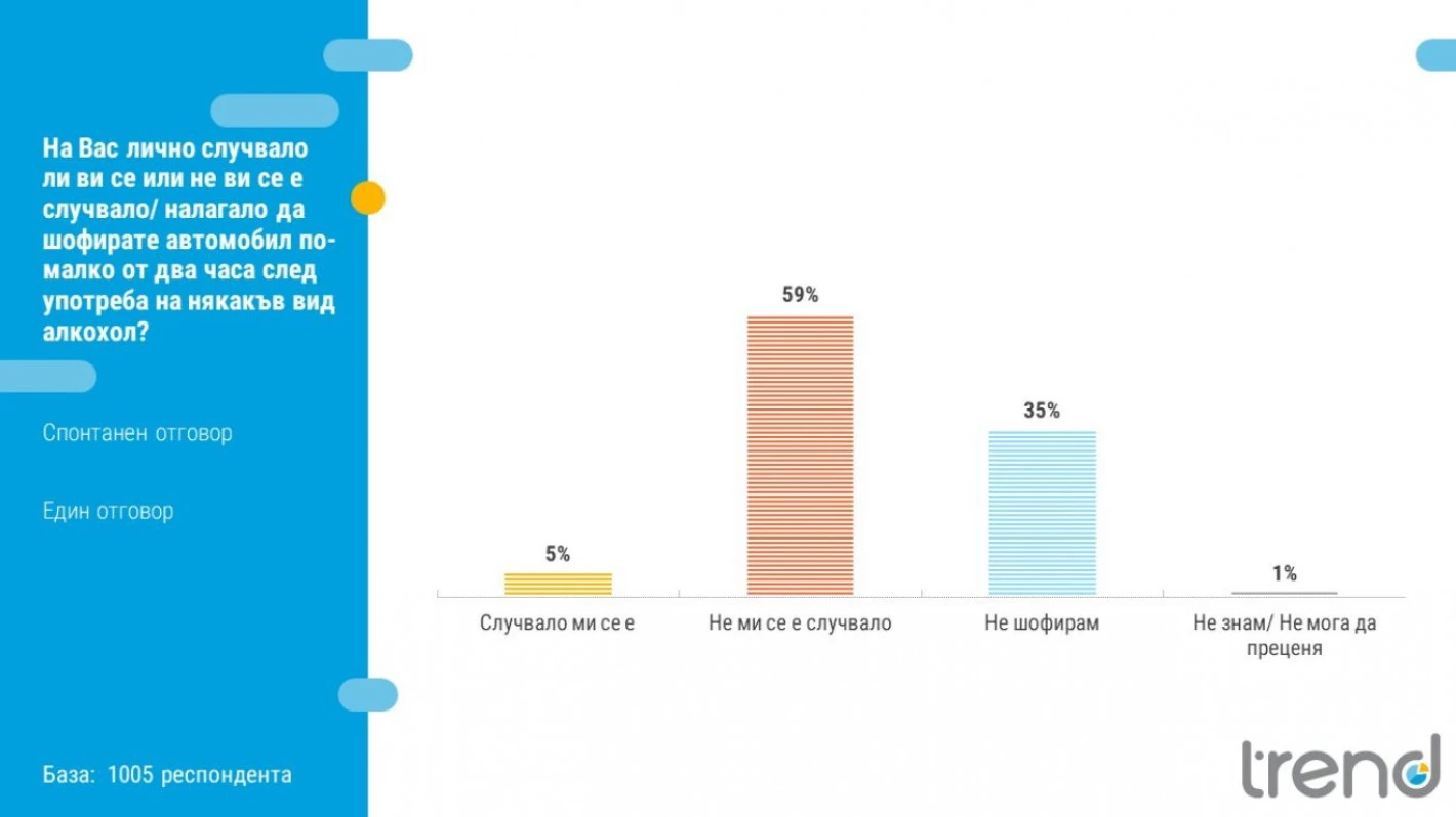 Според изследването на "Тренд" 275 000 българи (5%) признават, че те самите са се качвали да шофират в нетрезво състояние. Като най-често оправдание за това лицата посочват, че са се чувствали добре, или че пътуването е било за кратко разстояние.