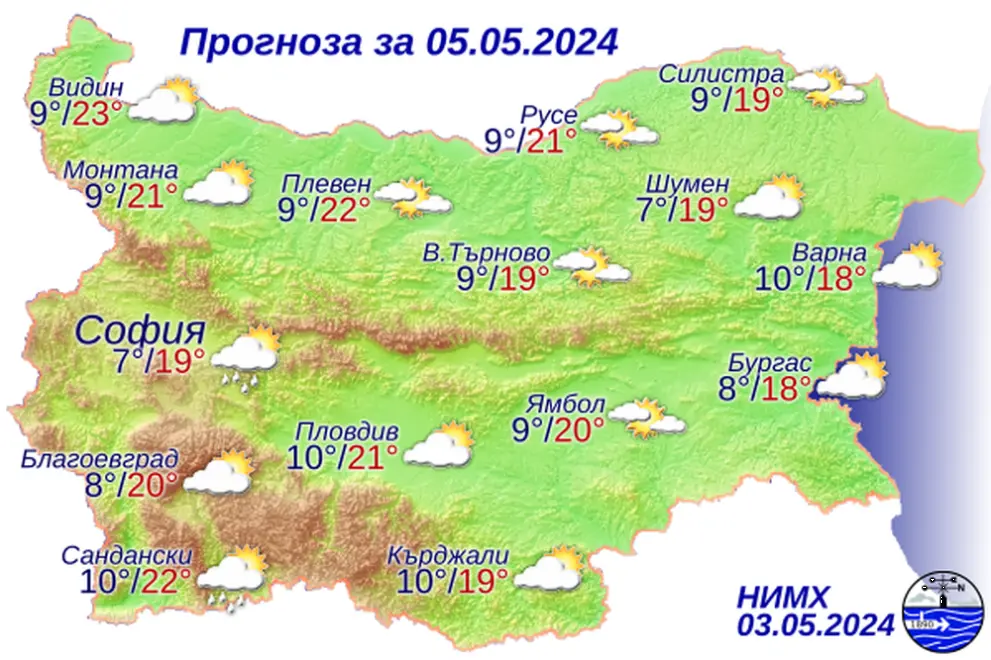 За Великден – 5 май, няма обявени предупредителни кодове. Очаква се да преобладава слънчево време. След обяд над планинските райони ще се развие купеста облачност, но само на изолирани места ще превали краткотраен дъжд. Минималните температури ще бъдат между 6° и 11°, а максималните - между 18° и 23°.