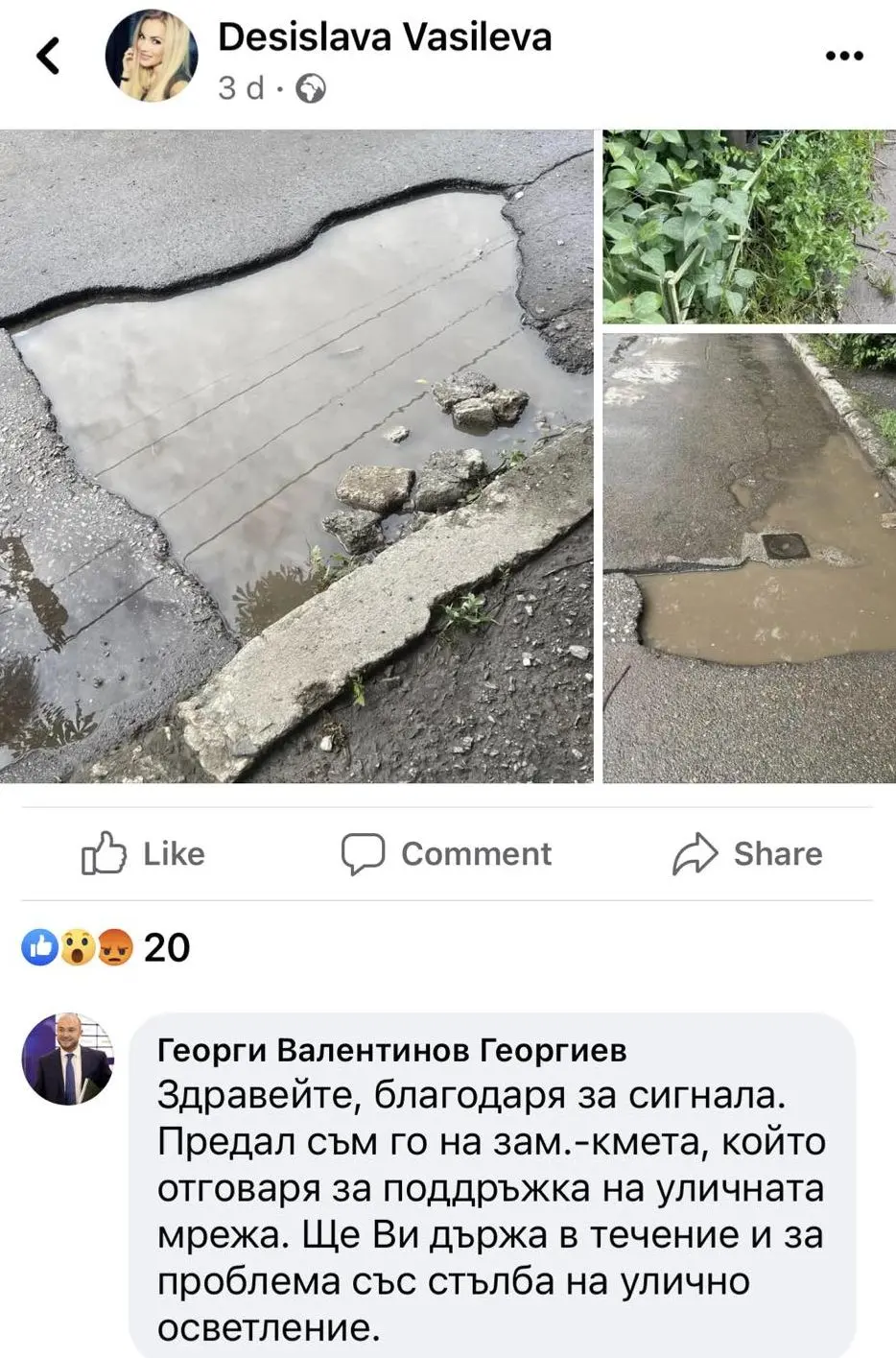 На поста й Георгиев отговори, че е предал сигнала на заместник-кмета, който отговаря за поддръжката на уличната мрежа. Шефът на СОС се ангажира да информира с развитието на сигнала, както и за проблема уличното осветление.