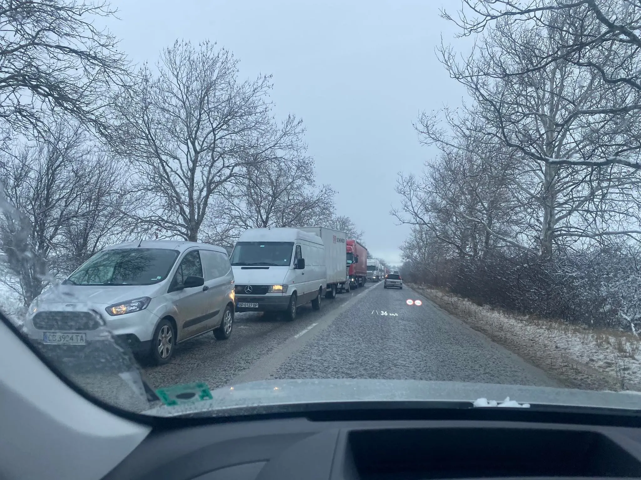 Наш читател алармира, че вместо да опитат да въведат регулация на движение в свободната лента, двата полицейски екипа на място не предприемат никакви действия. Към момента забавянето при преминаването на отсечката е повече от 45 минути. Очаква се в близкия час да бъдат предприети действия за отстраняване на катастрофиралия ТИР, което ще затвори изцяло пътя за около два часа.