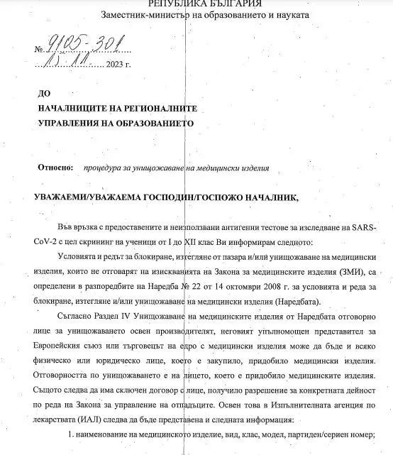 Стотици хиляди Covid тестове са бракувани от училищата, съобщават граждани до Tribune. Въпросните тестове са същите, които Николай Денков наложи да се закупят по време на неговото пребиваване в Министерството на образованието.