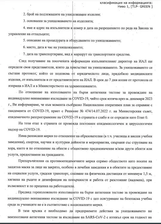Когато тестовете се поръчваха те струваха на държавата 13 милиона лева за близо 1.6 милиона теста. След като голяма част от тях са останали неизползвани, поради тяхната недостоверност, сега се бракуват.
