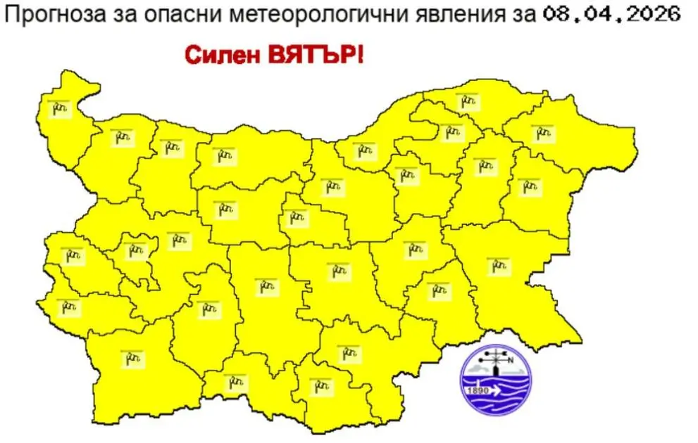 За цялата страна е обявен жълт код за силен вятър с пориви между 20 и 24 m/s.