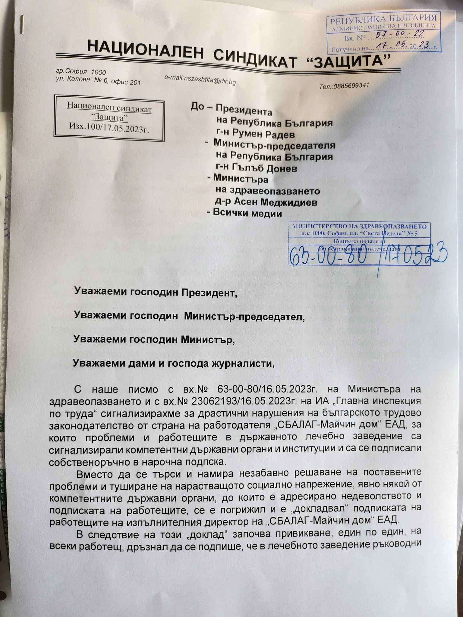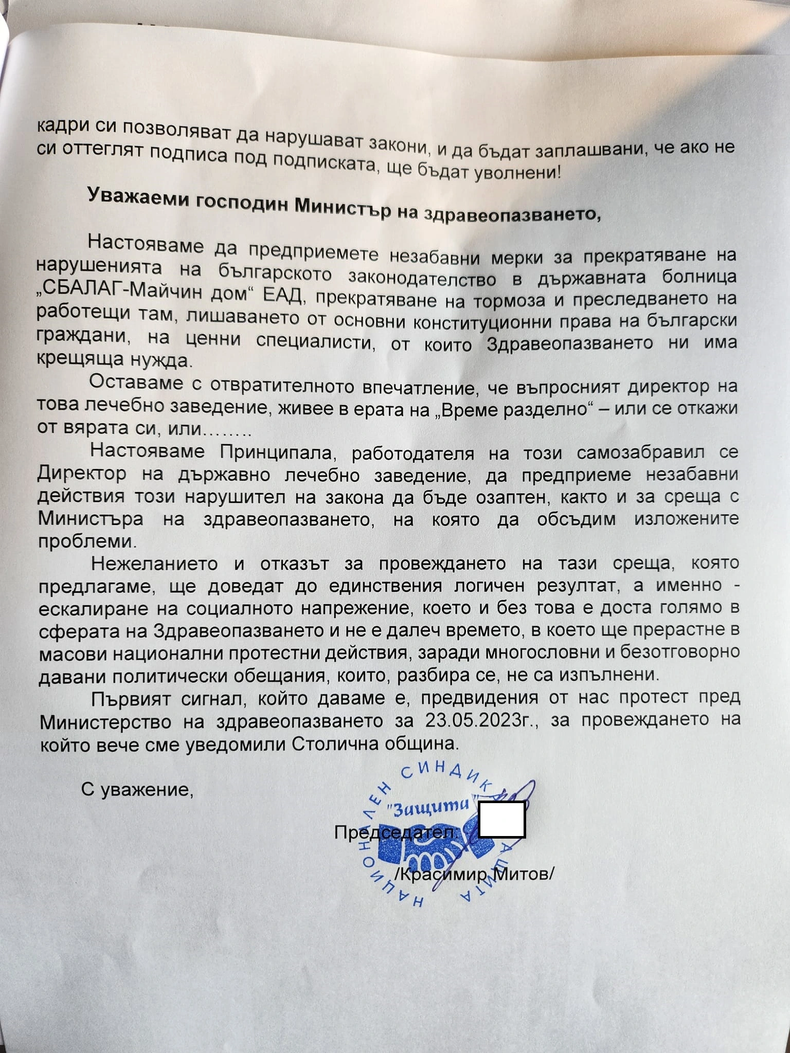 Сигнализирали сме за пореден път и очакваме да бъде проведена спешна среща с Министъра на здравеопазването с настояване на озапти развилнелия се чорбаджия в държавната болница, тъй като от другата седмица започваме протести пред Министерство на здравеопазването с искането на оставката на феодала обсебил и присвоил си „СБАЛАГ-Майчин дом“, и ако спешно не се стигне до прекратяване на подобно арогантно погазване на трудовото законодателство, ще бъде поискана не само оставката на директора на това лечебно заведение, но и на представляващия собственика на тази държавна болница – министъра на здравеопазването, който поне за сега се прави, че нищо не знае и толерира подобно поведение.
