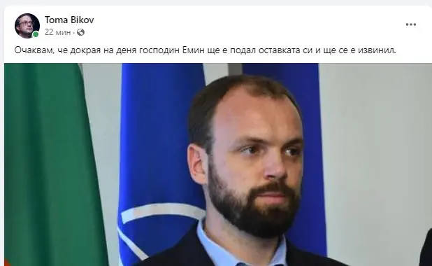 Депутатът от ГЕРБ Тома Биков заяви очакване до края на деня Мустафа Емин да е подал своята оставка и да се е извинил за поведението си.