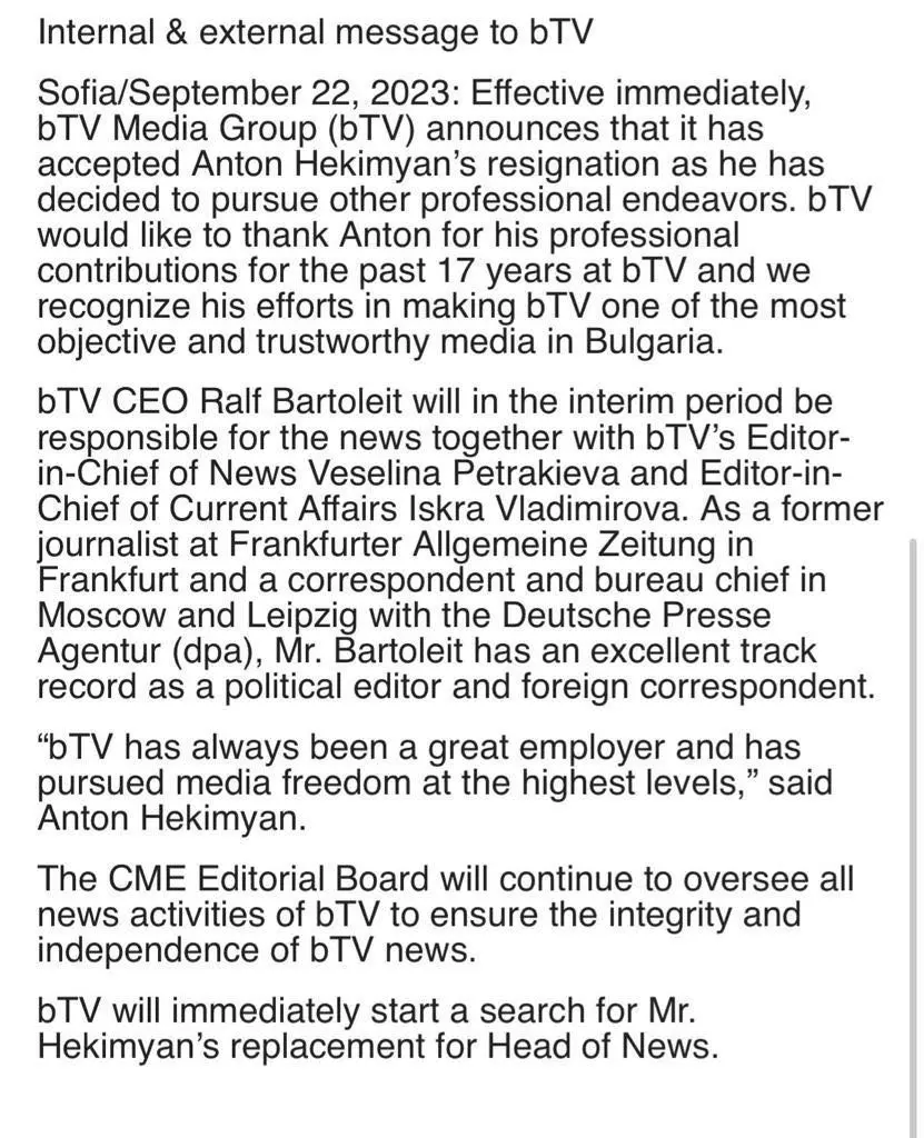 "bTV Media Group (bTV) обявява, че приема с незабавен ефект оставката на Антон Хекимян, директор „Новини, актуални предавания и спорт“, вследствие на неговото решение да продължи в друга професионална посока.