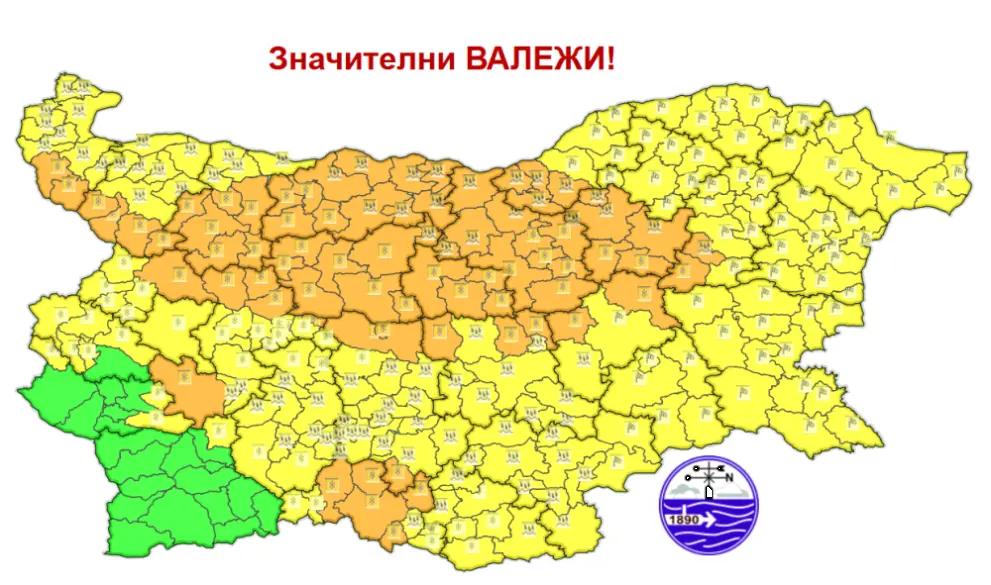 Обявиха оранжев и жълт код за снеговалеж, дъжд и вятър за днес, 25 декември, съобщиха от Националния институт по метеорология и хидрология (НИМХ).