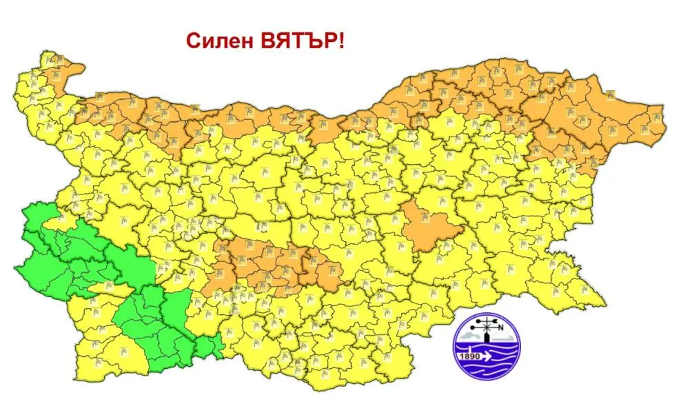 Оранжев код – за опасно време, е в сила за части от областите Видин, Монтана, Враца, Плевен, Велико Търново, Русе, Силистра, Добрич, Варна, Сливен, Стара Загора, Пловдив и Пазарджик.