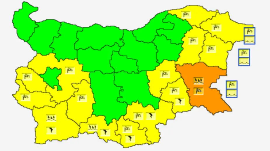 Оранжев код за опасно време е обявен за Бургаска област, където синоптиците от НИМХ очакват интензивни валежи и гръмотевични бури. Жълт код за валежи и/или силен вятър е издаден за 14 области - Варна, Добрич, Силистра, Разград, Ямбол, Сливен, Хасково, Кърджали, Смолян, Пазарджик, Благоевград, Кюстендил, Перник и София-област.