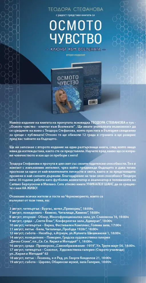 Теодора Стефанова представя второто издание на книгата си „Осмото чувство – ключът към Вселената“. Тя ще обиколи 12 града в страната и ще разкрие тайните на бъдещето.