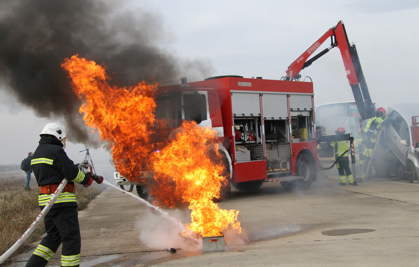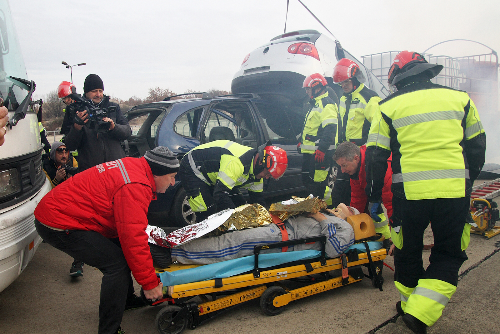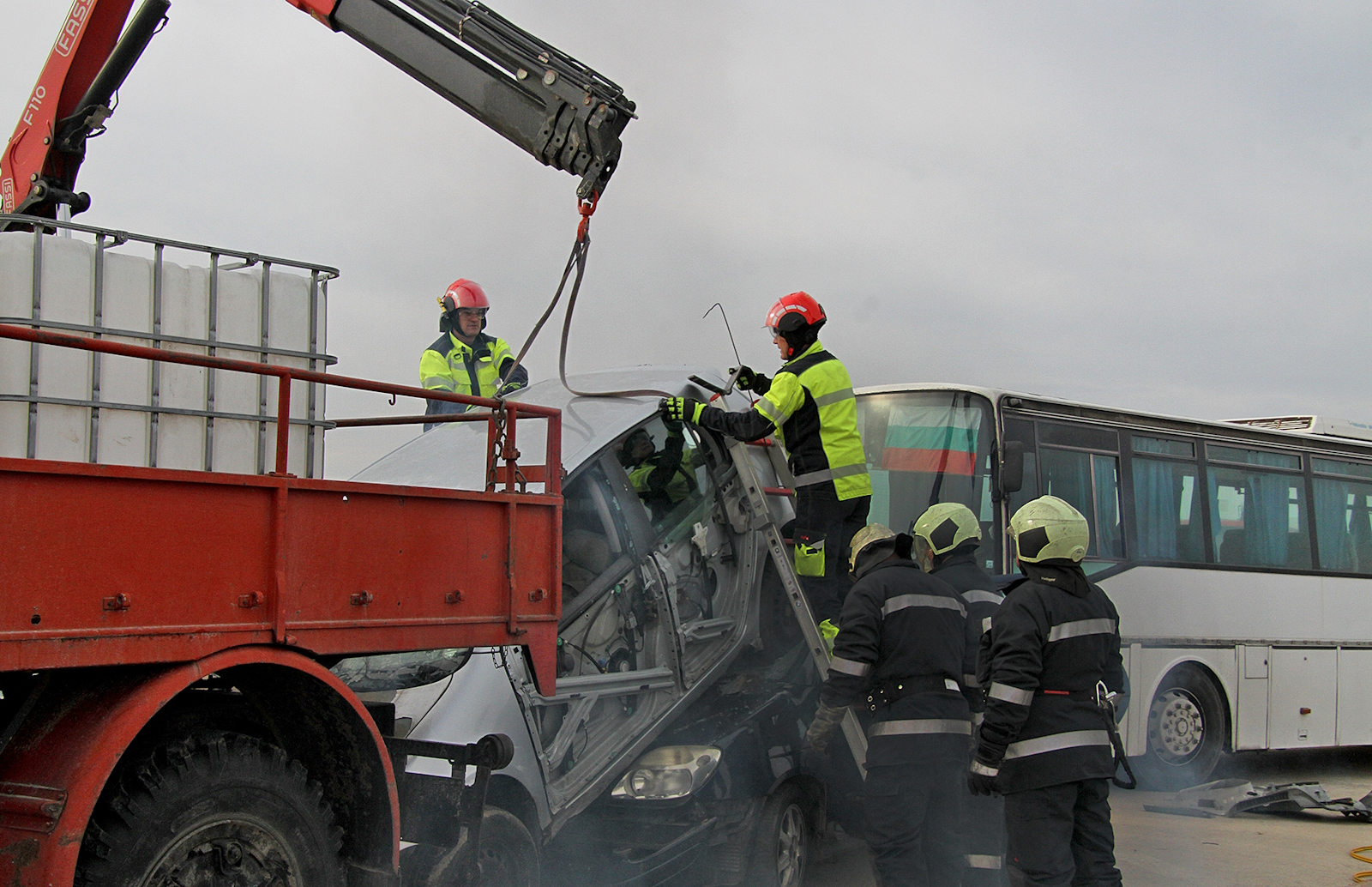 По време на учението бе инсцениран тежък инцидент на 154 км. на автомагистрала "Тракия" между товарно превозно средство, автомобили и автобус.