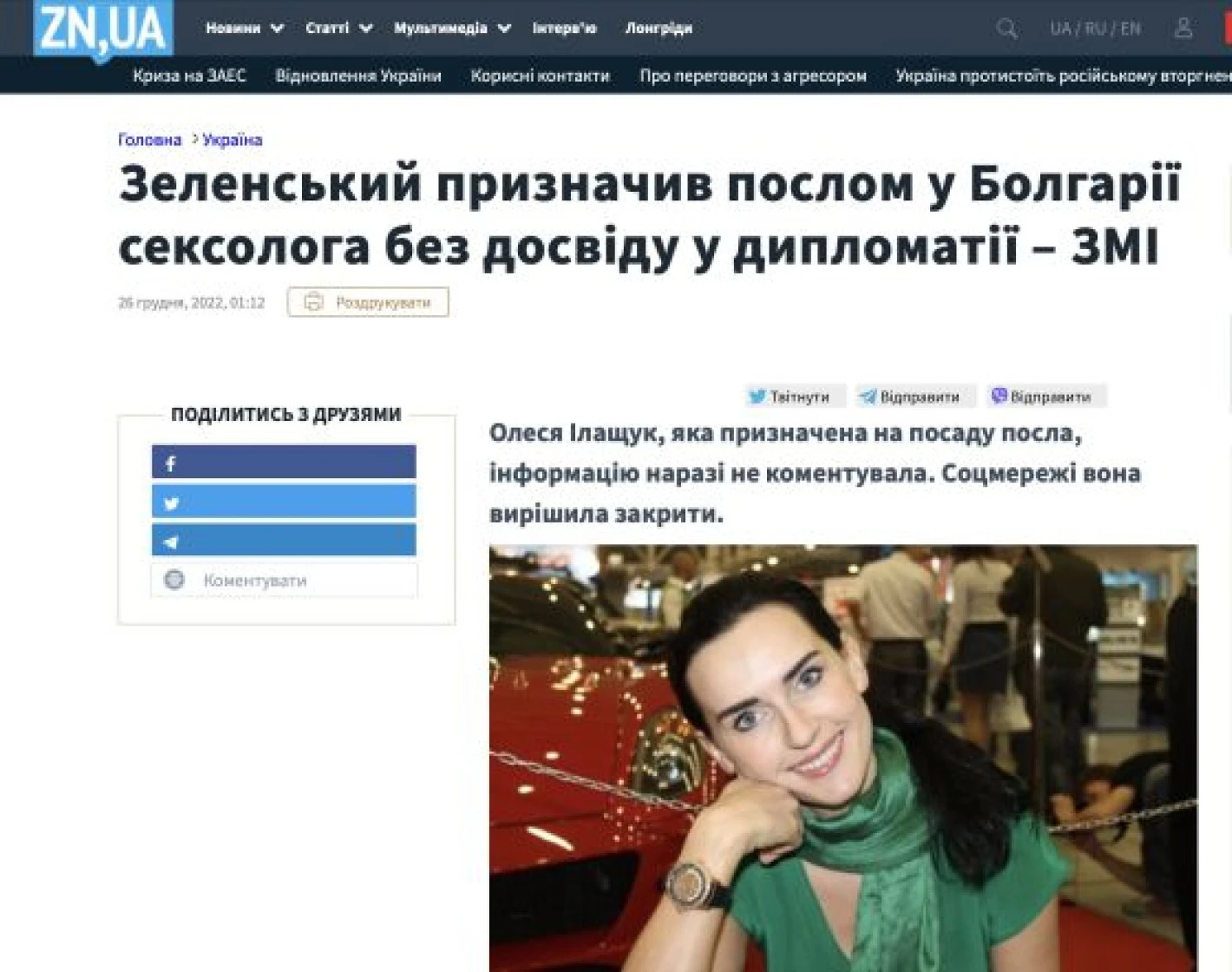 Авторитетното украинско издание "Європейська правда" твърди, че Олеся Илашчук, назначена от президента Володимир Зеленски за нов посланик на Украйна в България, "няма опит нито в дипломацията, нито в държавната администрация и досега се е представяла като специалист по сексология и скъпоценни бижута".