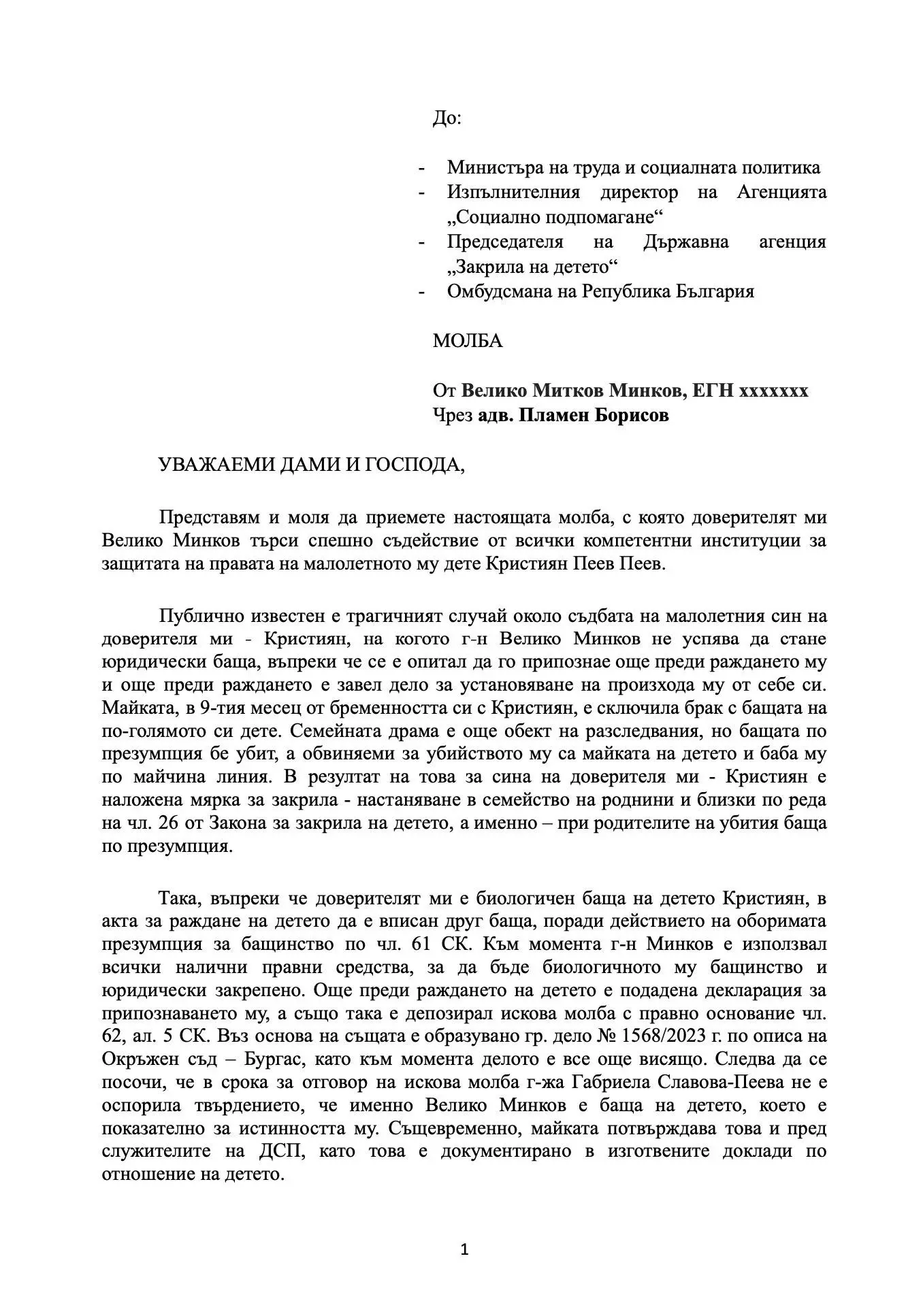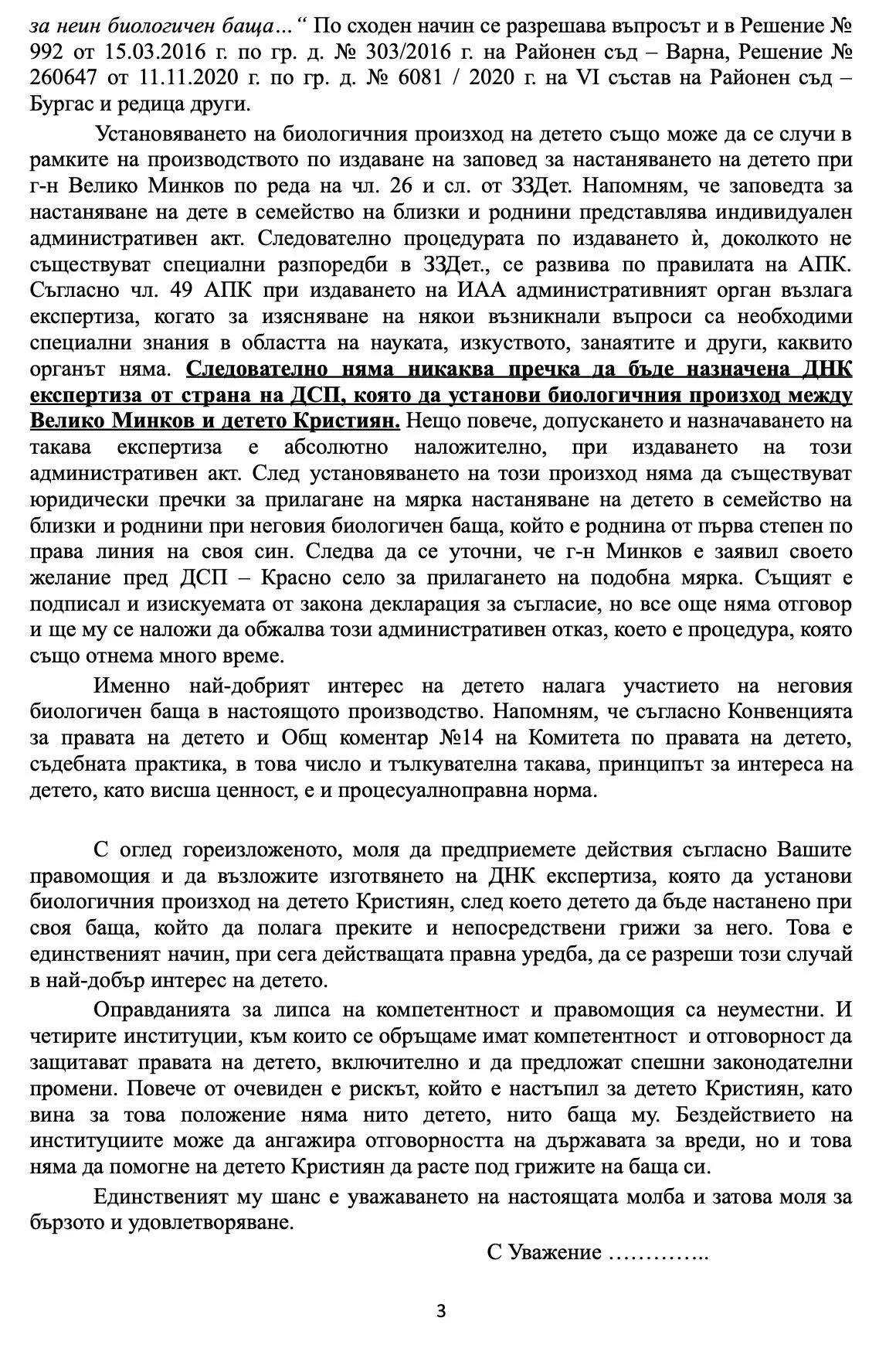 „Молбата ни с адвокат Пламен Борисов към четирите институции, които могат да направят така, че да се случи ДНК тестът по административен (а НЕ съдебен) ред. Никой няма да върне детството на детето с оправданията си!“, написа той във Фейсбук.