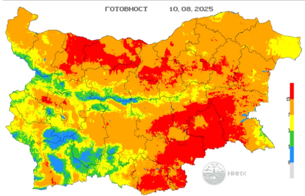 Задава се опасност от пожари през уикенда. На 9 и 10 август части от страната са оцветени в червено, което означава, че има опасност от много силни пожари, предупредиха от НИМХ.